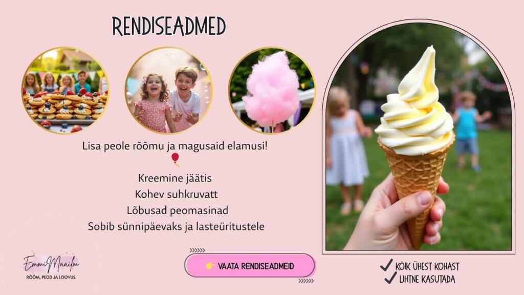 EmmiRent pakub hooajaliselt laia valikut rendiseadmeid, mis muudavad iga peo ja sündmuse eriliseks – batuudid, pehmejäätise-, suhkruvati-, mulli- ja tossumasinad ning palju muud.