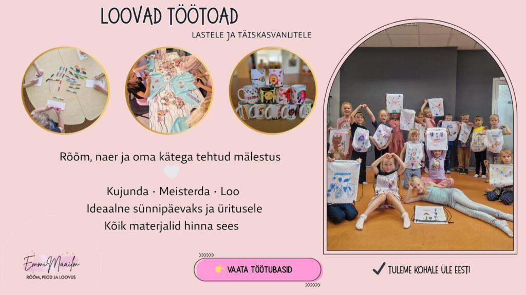 Korraldame ka loovaid töötubasid, mis sobivad suurepäraselt lasteaedadesse, koolidesse ja sünnipäevadele.