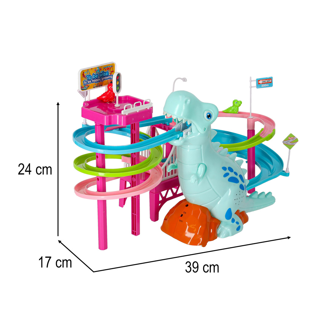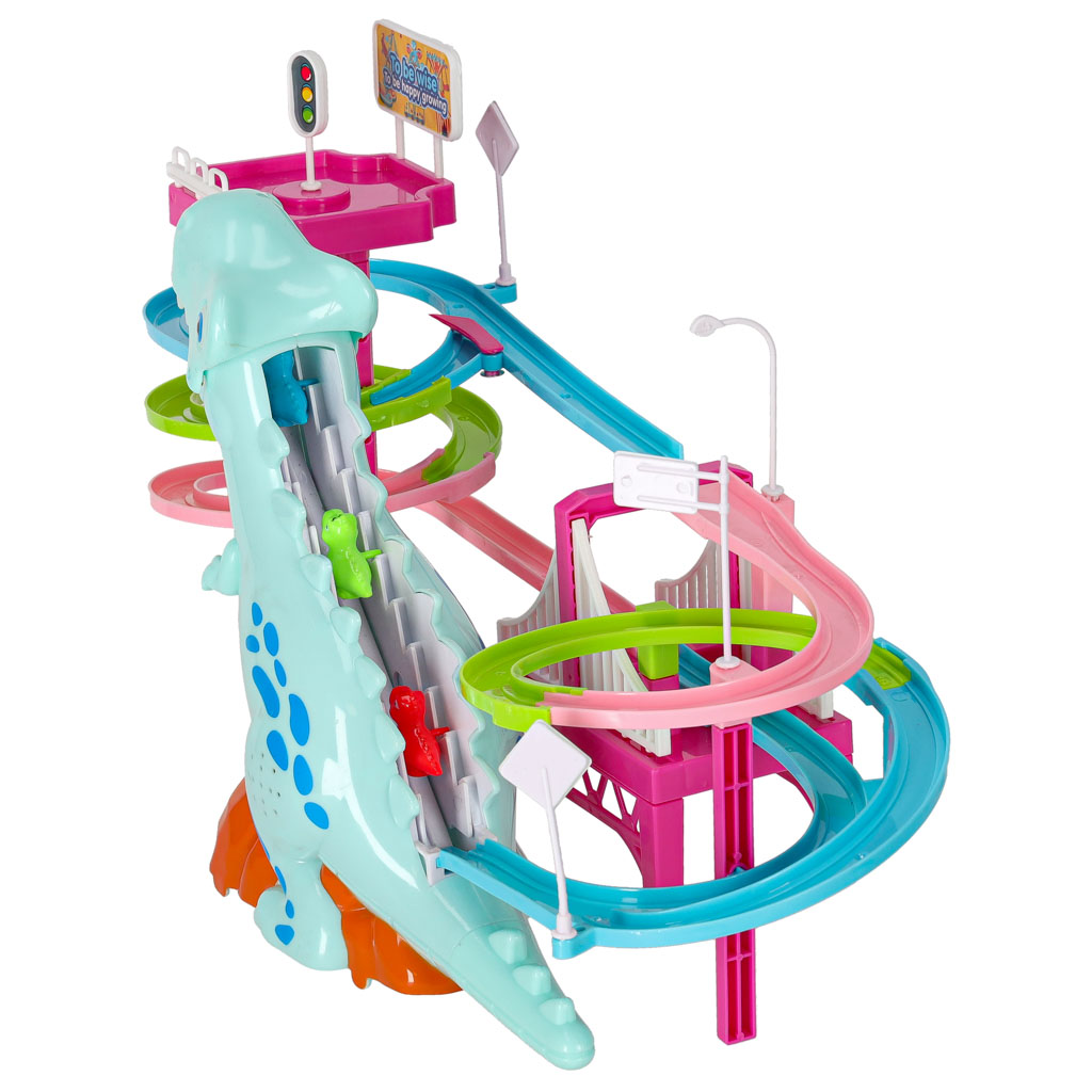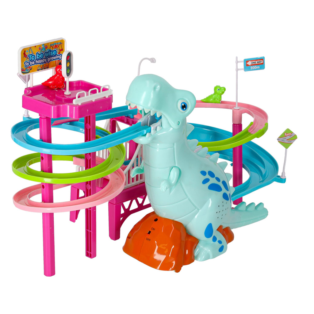 Võistlusrada, kus dinosaurus neelab väikeste dinosauruste kujulisi autosid, on lastele väga lõbus.