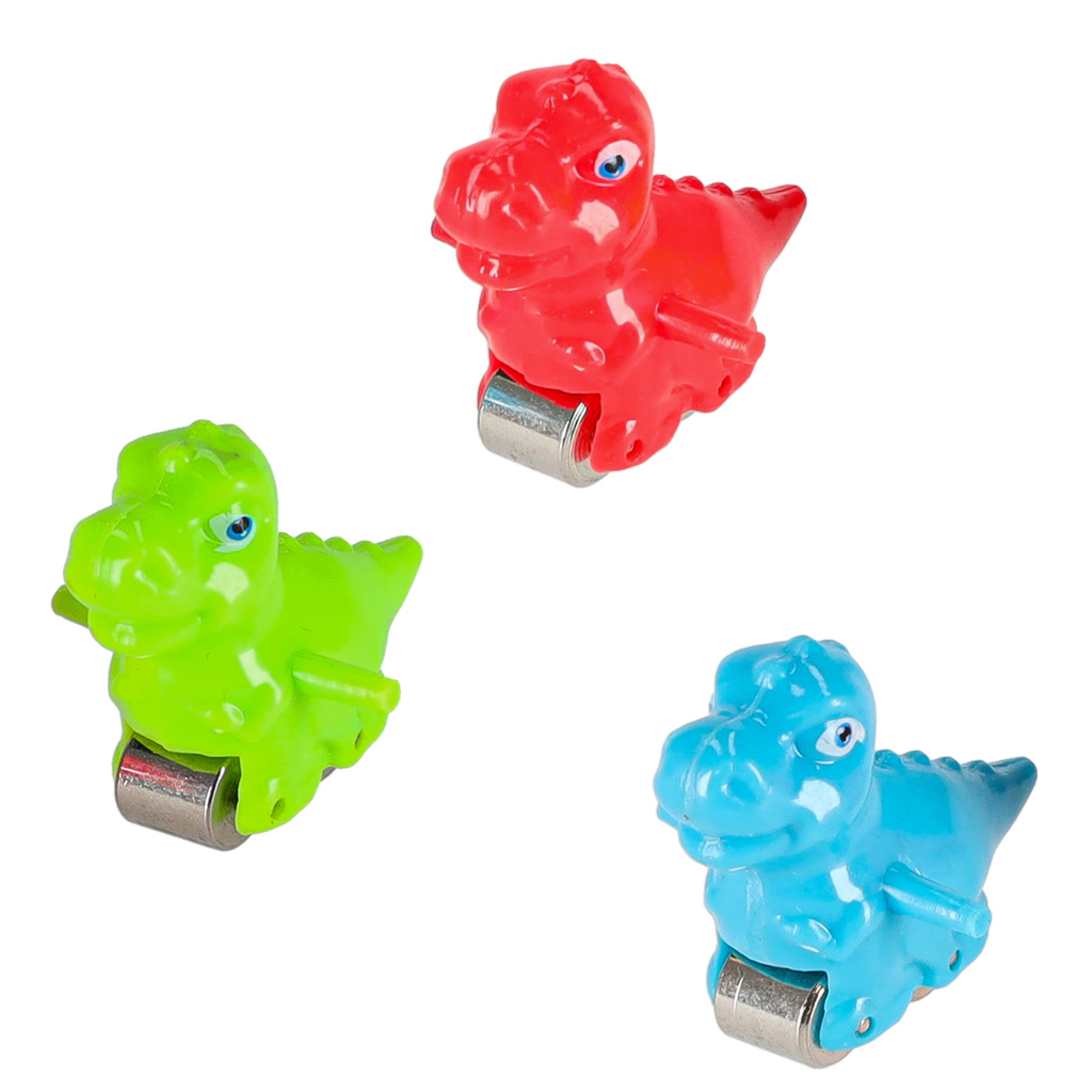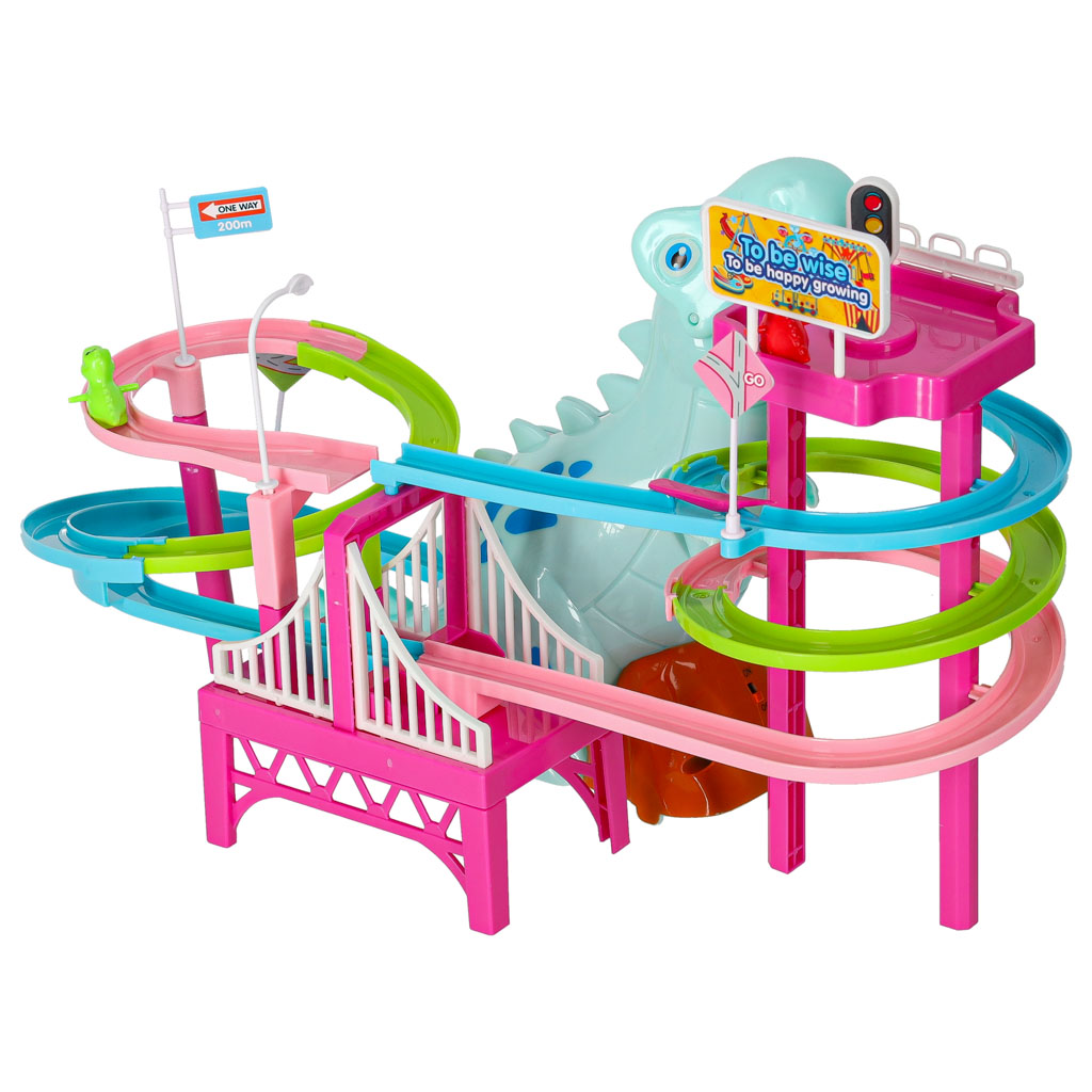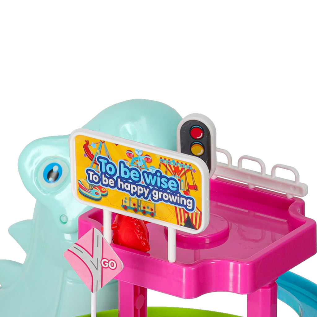 Võistlusrada, kus dinosaurus neelab väikeste dinosauruste kujulisi autosid, on lastele väga lõbus.