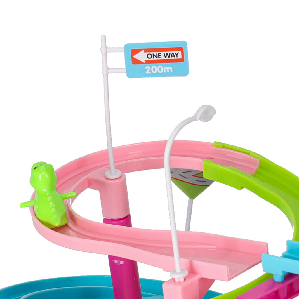 See on mänguasi, mis teeb helisid. Autodel on oma ajam, nii et nad saavad üles- ja allakäigul mööda kurvilist rada sõita.
