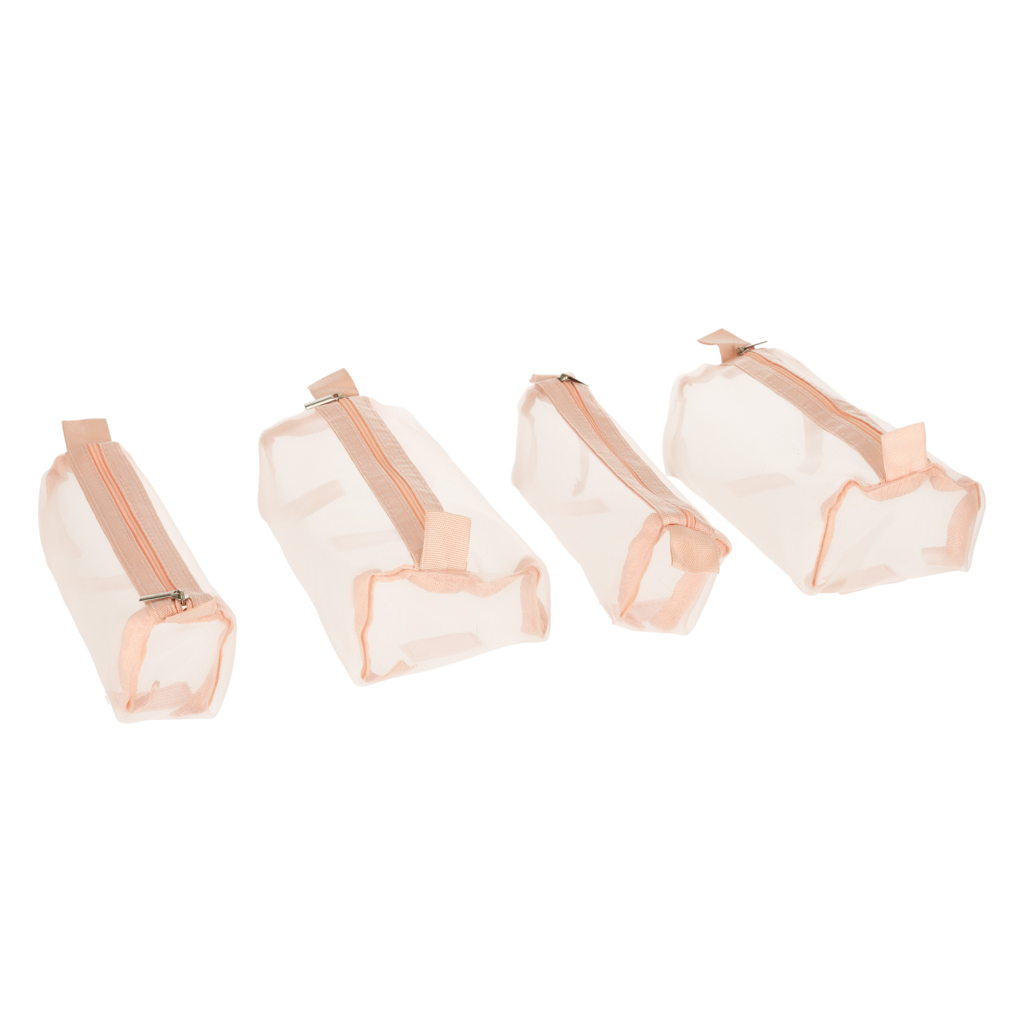 Roosa meigikott reisimiseks – saab kokku rullida, et võtta vähem ruumi pagasis. Sellel on neli lahtrit, mida saab välja võtta. Lahtrite seinad on valmistatud võrgust, mis hõlbustab toodete leidmist ja tagab ka niiskete pakendite hea ventilatsiooni.