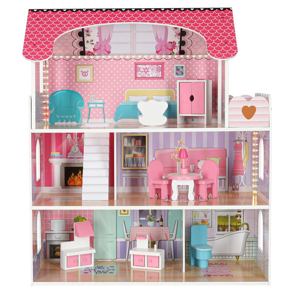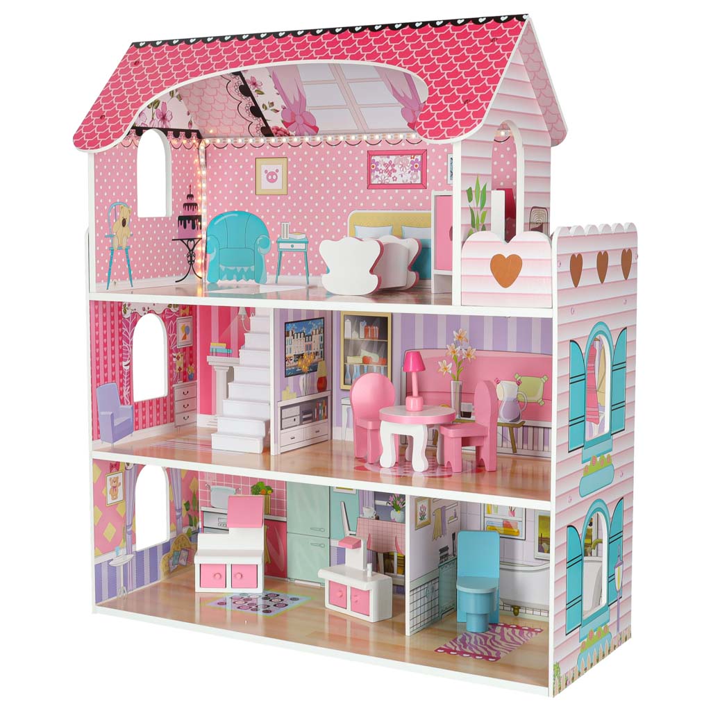 MDF puidust nukumaja + mööbel 70cm roosa LED