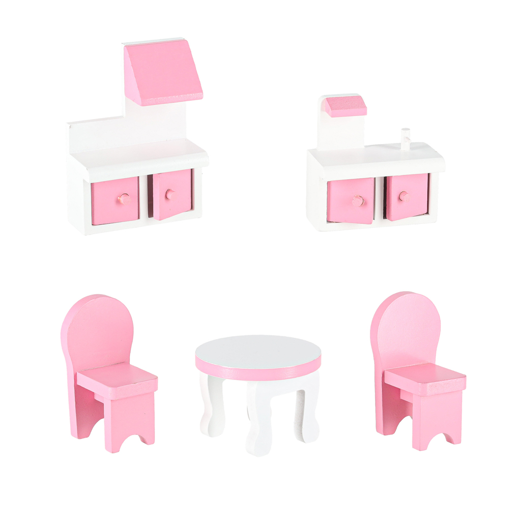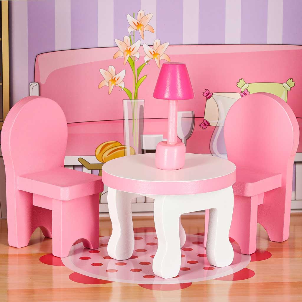 Kaunis mööbel on lisatud. Tarvikud on valmistatud puidust. Näiteks köögina toimivas ruumis on ilus mööbel, millel on avatav uks. Kaasasolevad tarvikud on suurepärane täiendus igasse tuppa ja tulevad koos mängides kasuks.