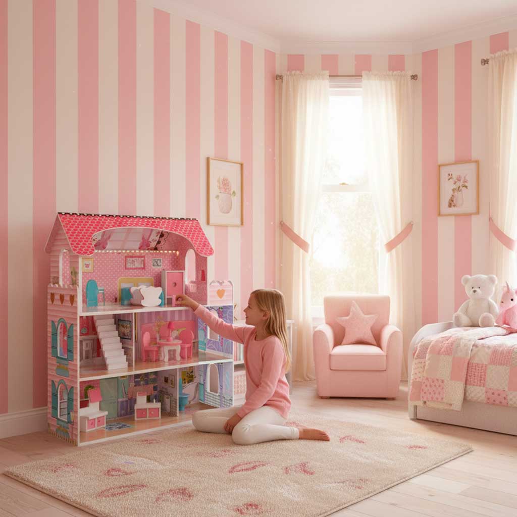 Miniatuurne mööbel, graafika seintel ja LED-valgustus muudavad meie nukumaja ainulaadseks ja väga hubaseks.