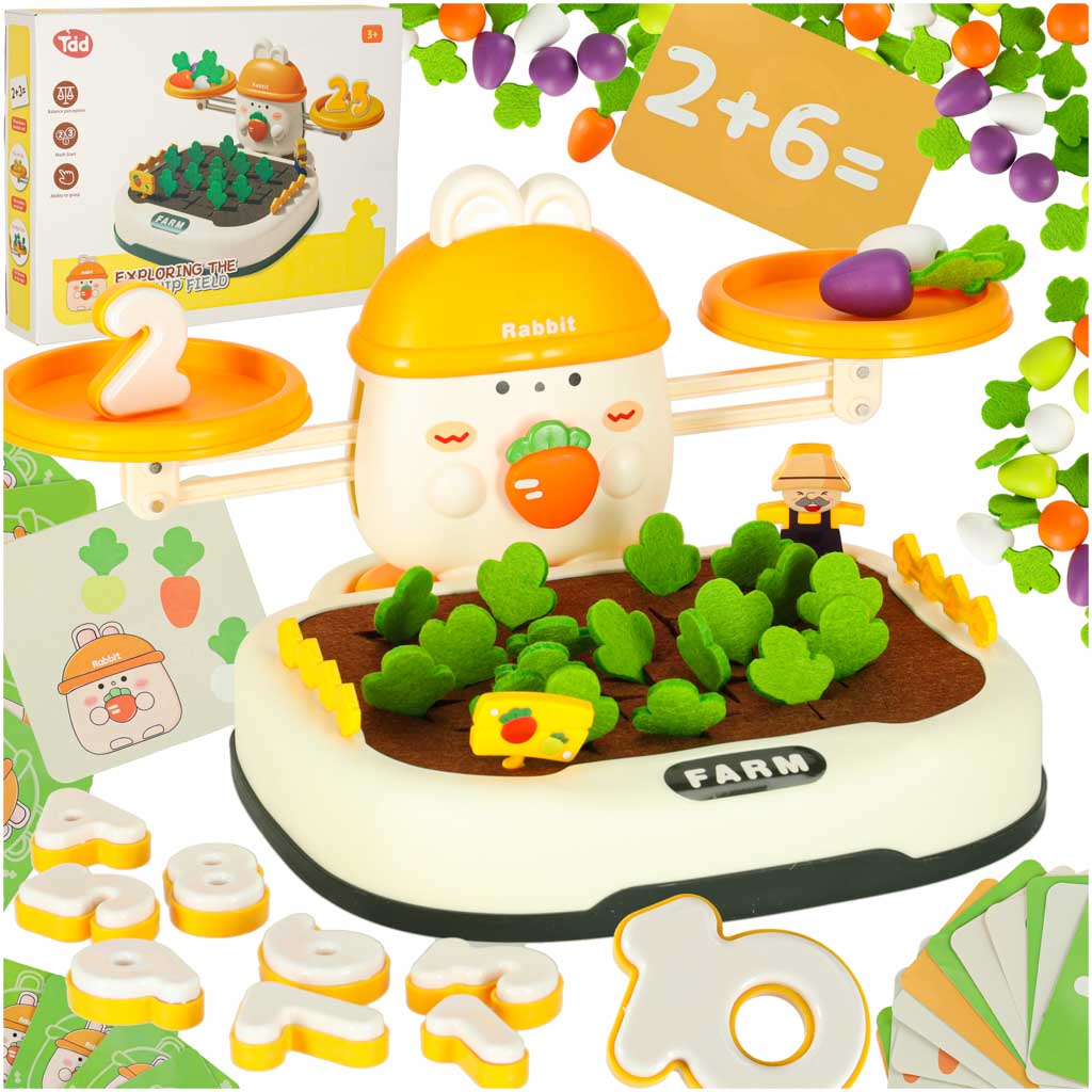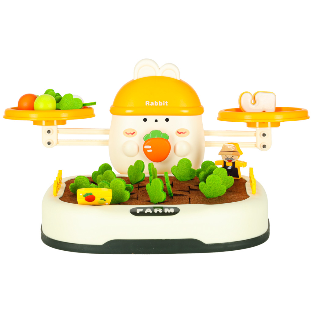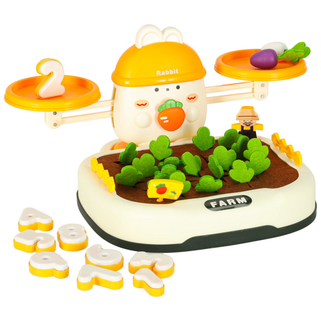 Armas jänes valitseb komplekti tipus, “valvab” tasakaalu. Laps saab porgandeid või muid esemeid kuhjata, püüdes tasakaalu säilitada või seda tahtlikult häirida, õppides samal ajal füüsika ja loogilise mõtlemise põhitõdesid. Komplektis on ka spetsiaalsed numbrid – igal numbril on vastav kaal, mis vastab kujutatud numbrile. See võimaldab väikelapsel katsetada, võrrelda kaalu ja õppida numbrilisi väärtusi praktikas! See mäng sobib suurepäraselt lugemise ja matemaatiliste põhimõistete õppimise toetamiseks.