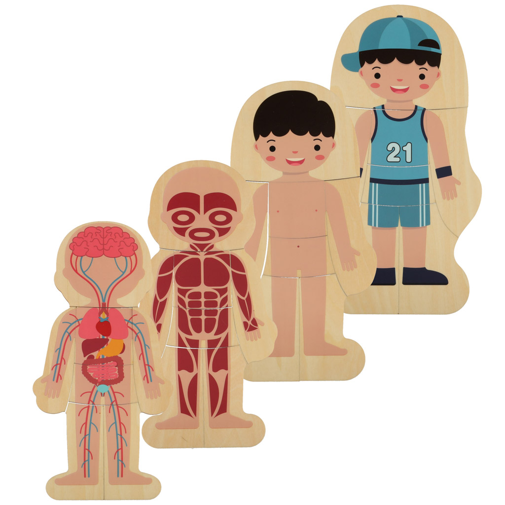 Pusletükid on asetatud üksteise peale kihtidena. Väikelapse ülesanne on järjestada inimese skelett, siseorganid, lihased, keha ja lõpuks riided. Abiks on komplekti kuuluv puidust alus.