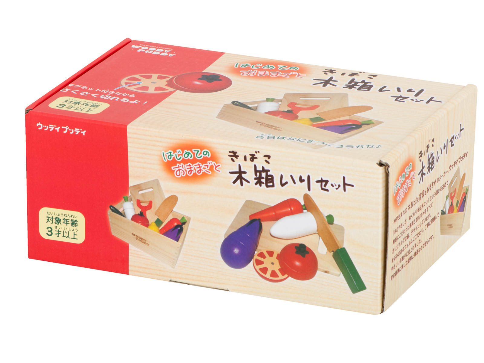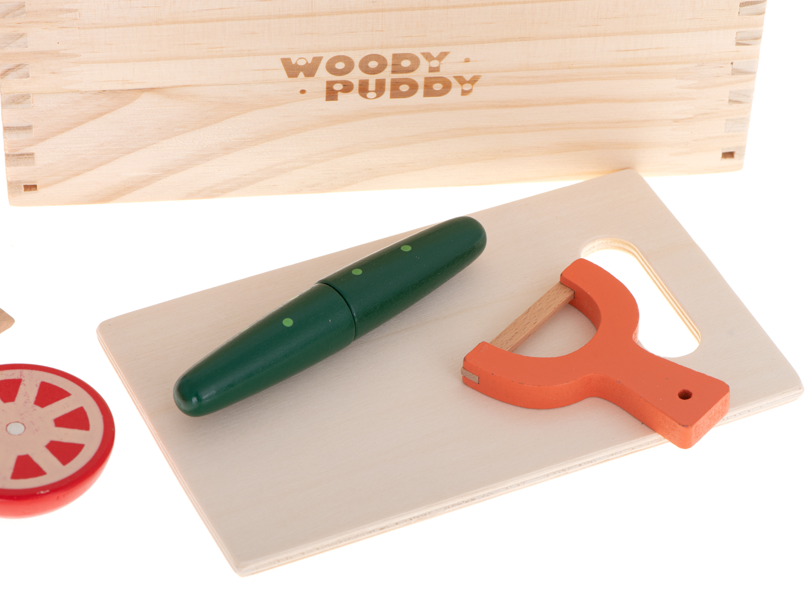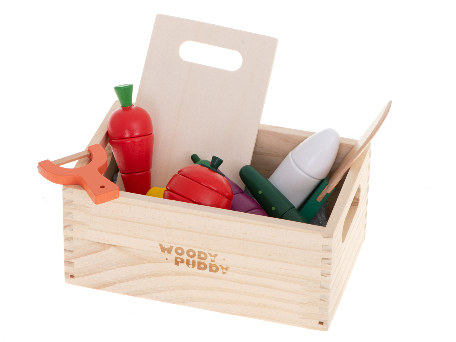 Värvilised köögiviljad puust kastis, et valmistada maitsvat õhtusööki kõigile oma nukkudele ja kaisuloomadele.