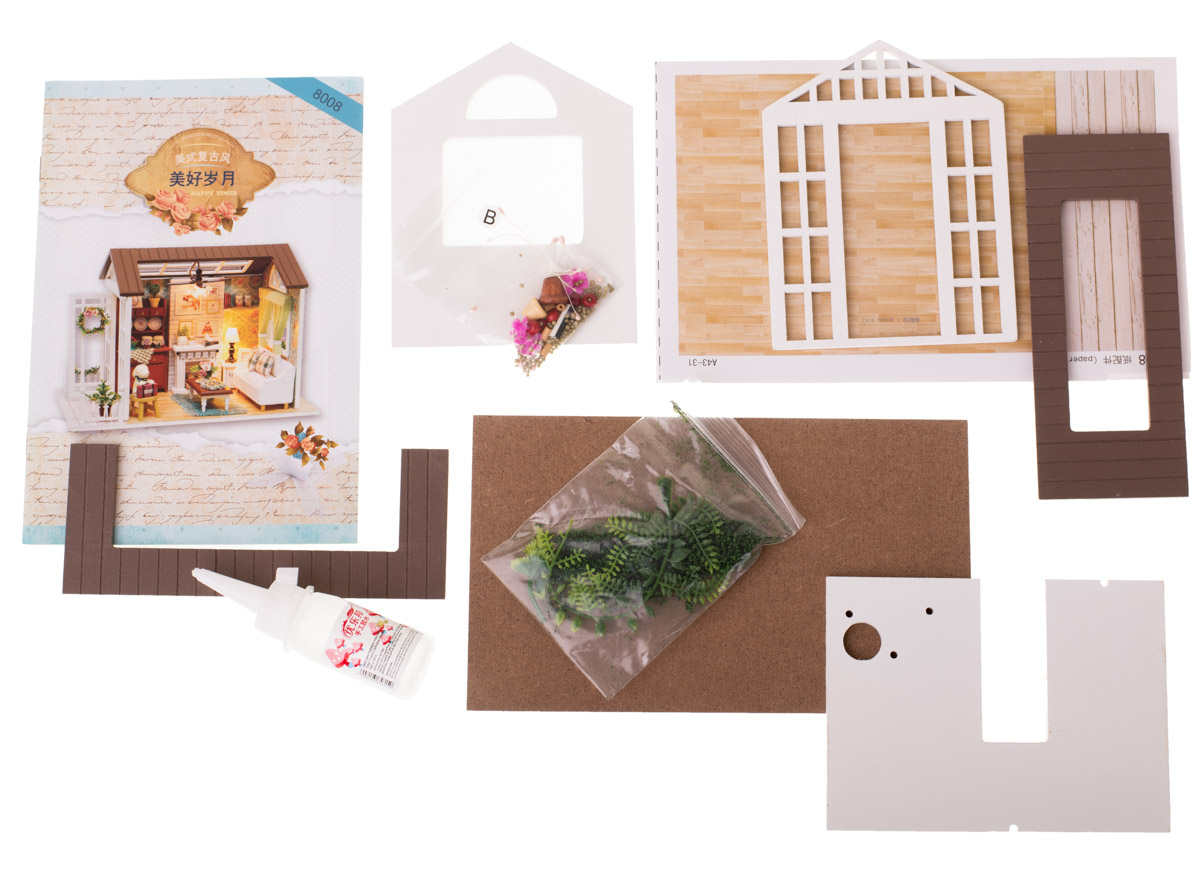 Ilusalt puidust elutuba, mis on mõeldud ise kokkupanemiseks.