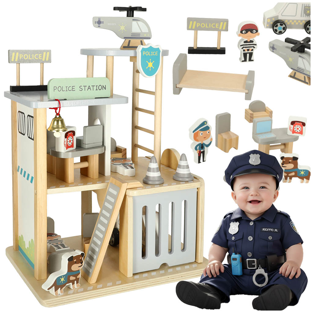 täielikult puidust – politseijaoskond ja tarvikud on valmistatud kvaliteetsest puidust, et teie laps saaks mänguasja võimalikult kaua nautida.