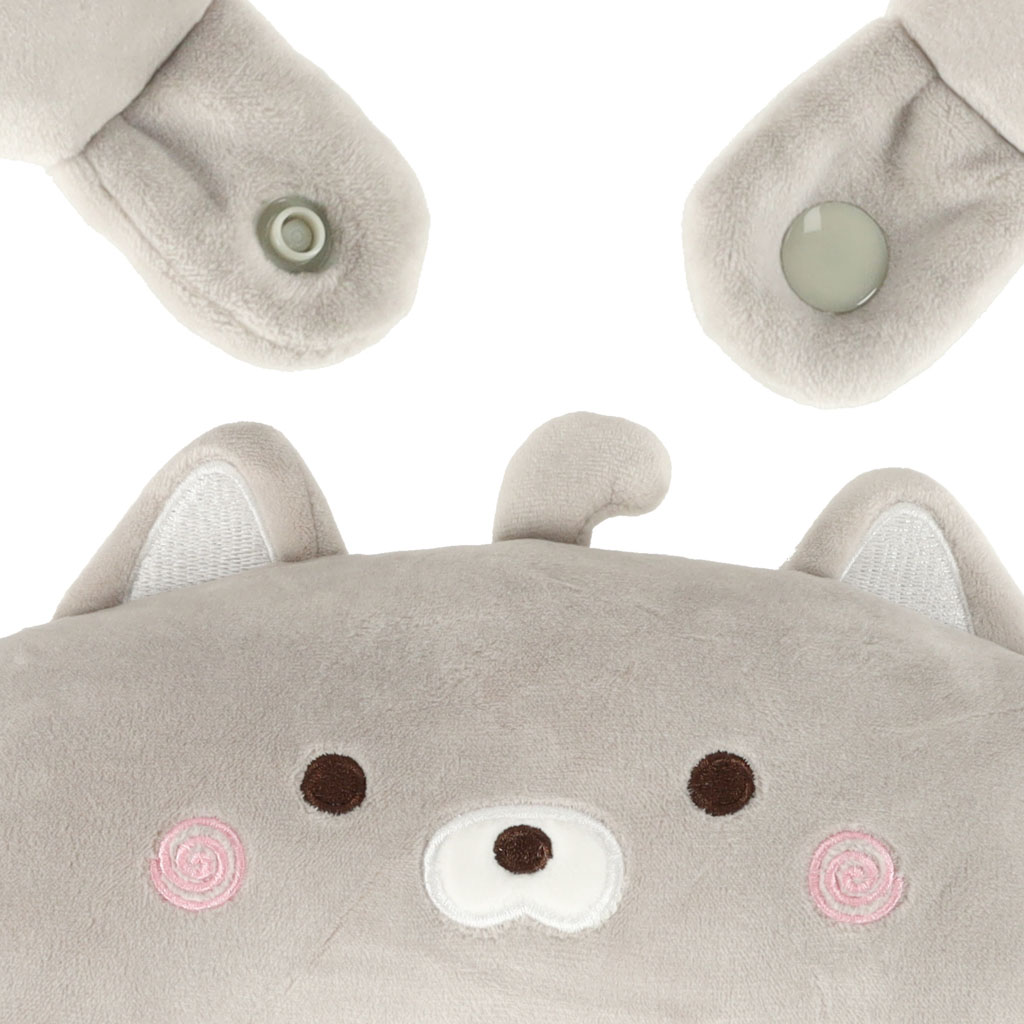 – Kaks ühes – maskott ja padi – armas kass, mis ümberpööratuna muutub mugavaks reisipadjaks croissant’i kujul. Ideaalne igapäevaseks kasutamiseks ja reisimiseks