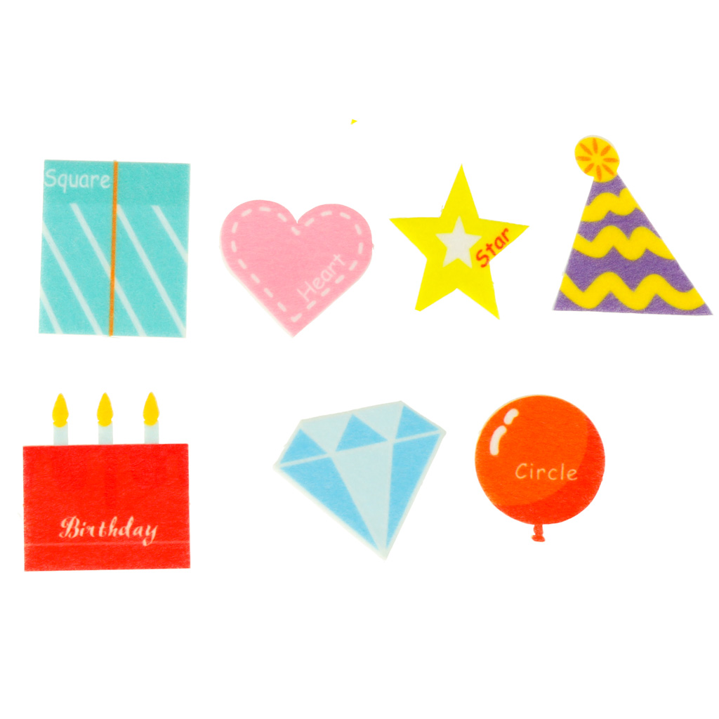 – Kleebised: süda, õhupallid , täht, kook, kingitus, kooniline sünnipäevamüts, dinosaurus