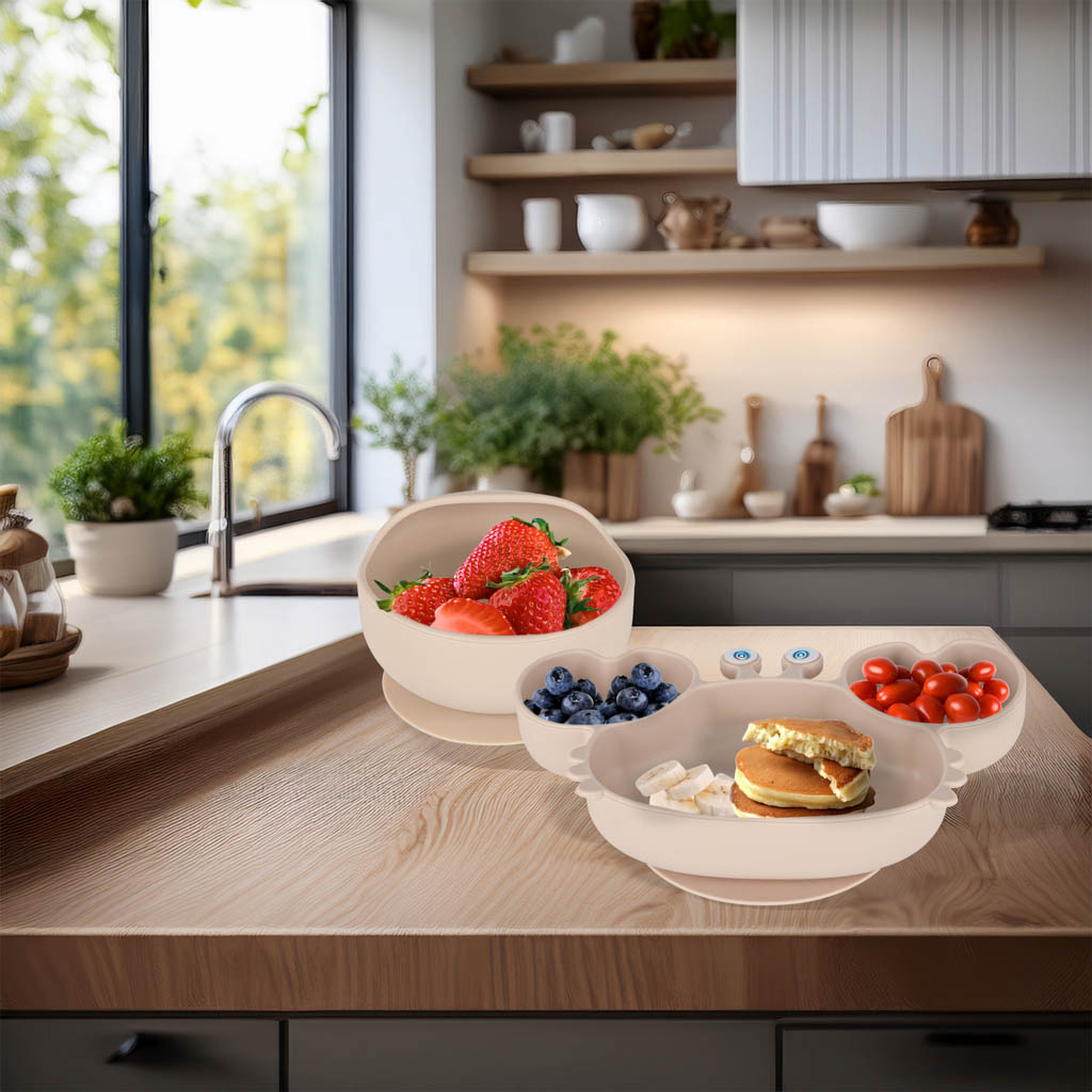 Nõud on valmistatud BPA-vabast silikoonist, nii et saate oma pisipoja toitu nendega julgelt serveerida.