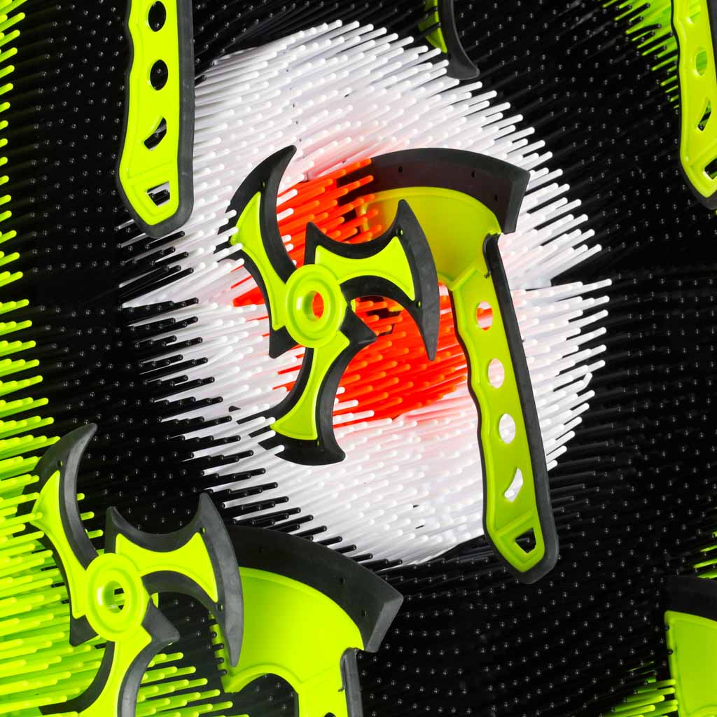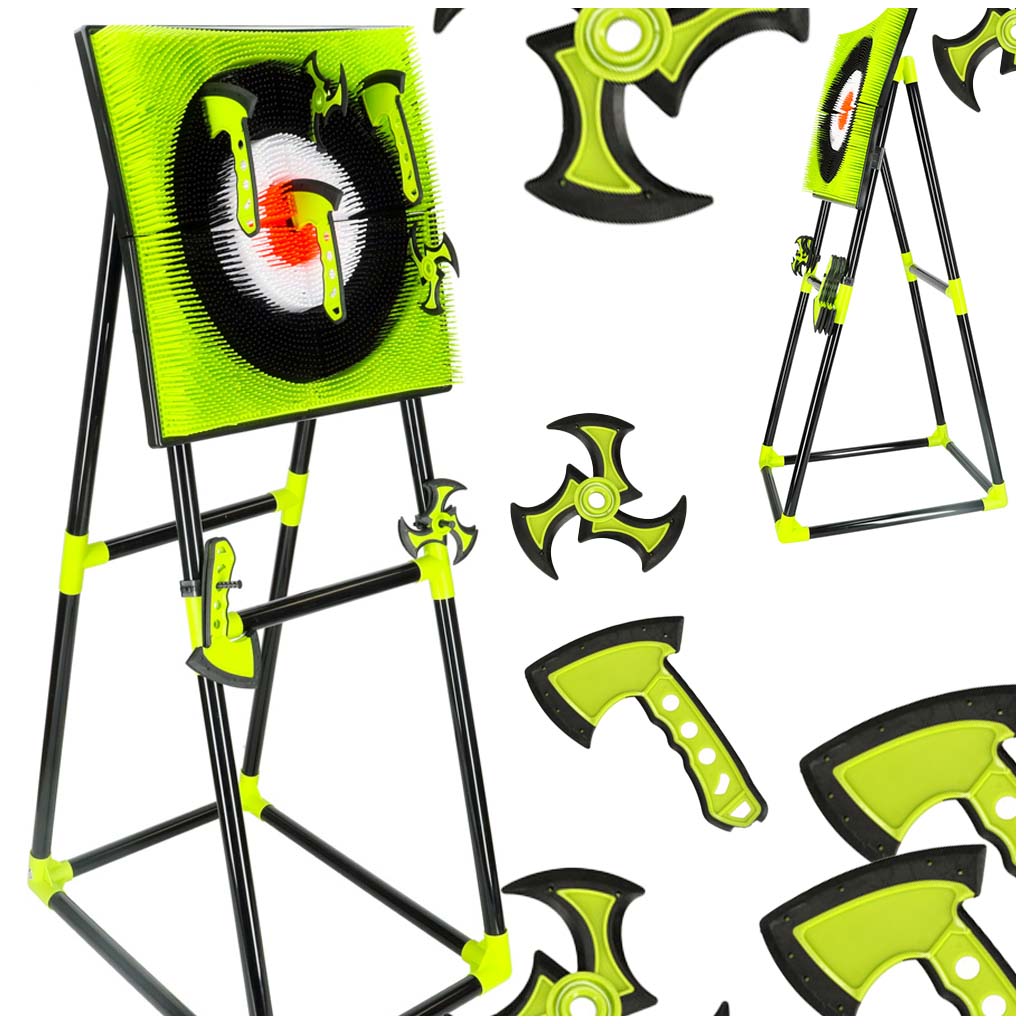 Plastikust kirved ja shurikenid on kaetud pehme silikooniga, mistõttu on neid täiesti ohutu visata. Iga tarvik on hoolikalt meisterdatud, et tagada autentne välimus ja põnev lõbu. Tugevast plastikust statiiv koos käepidemetega võimaldab tarvikuid hõlpsasti hoiustada ja komplekti kiiresti ette valmistada järgmiseks treeninguks. See võimaldab teie lapsel igal ajal oma oskusi lihvida.
