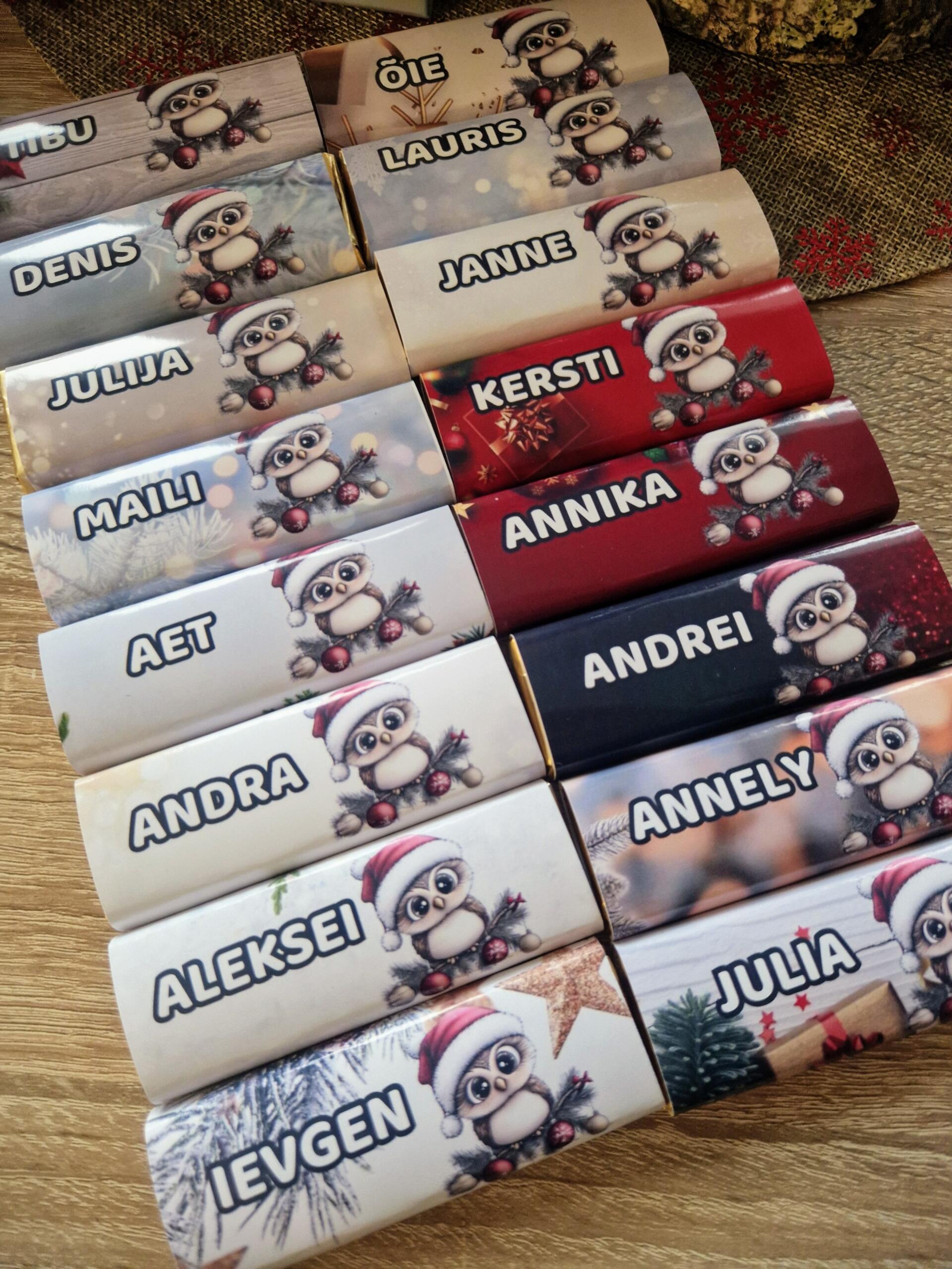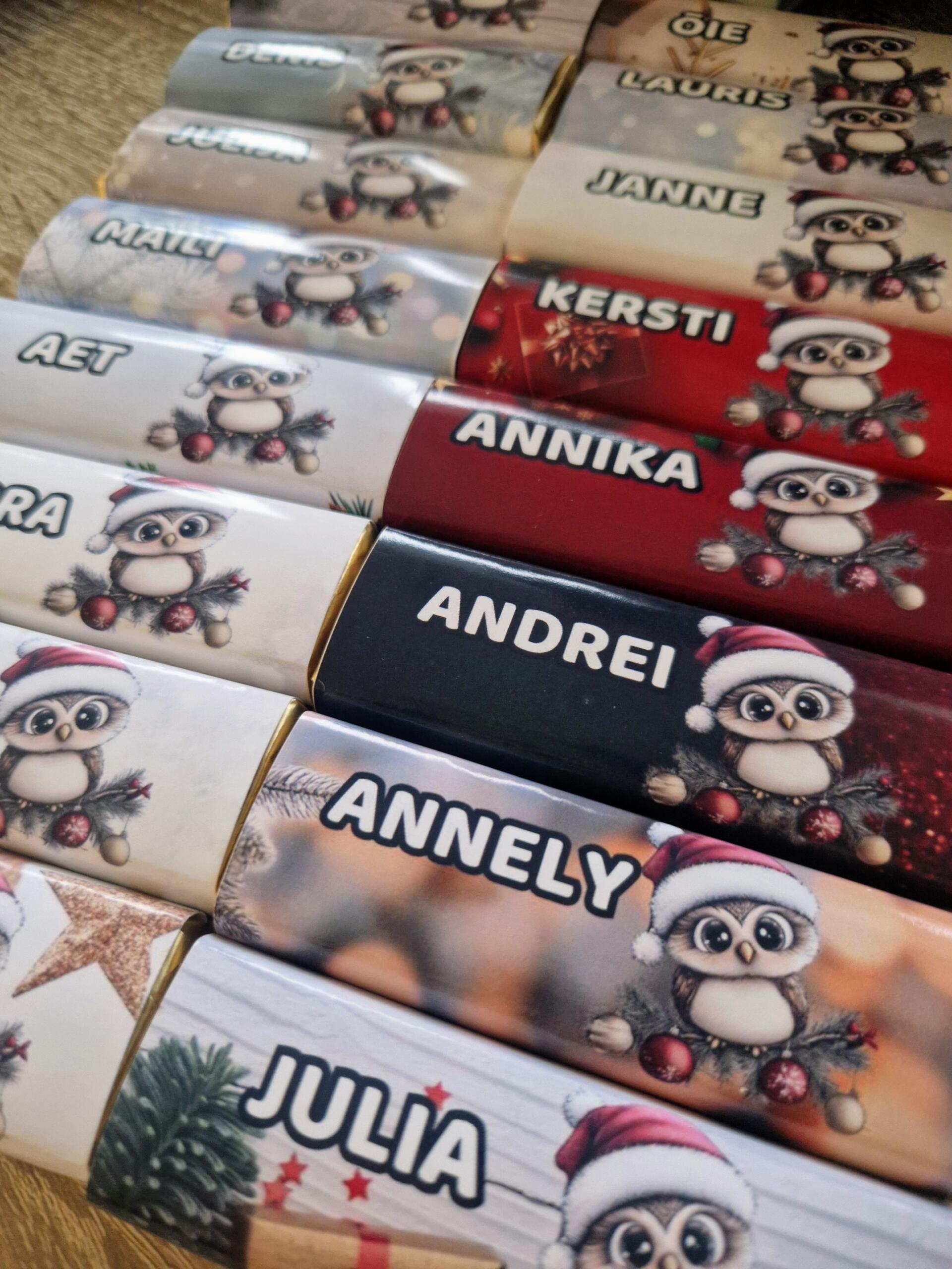 Kasutame kvaliteetset piimašokolaadi, mille originaalpakend jääb alati šokolaadi kaitseks alla. Meie lisame ümber sinu soovidele vastava disainitud paberi.