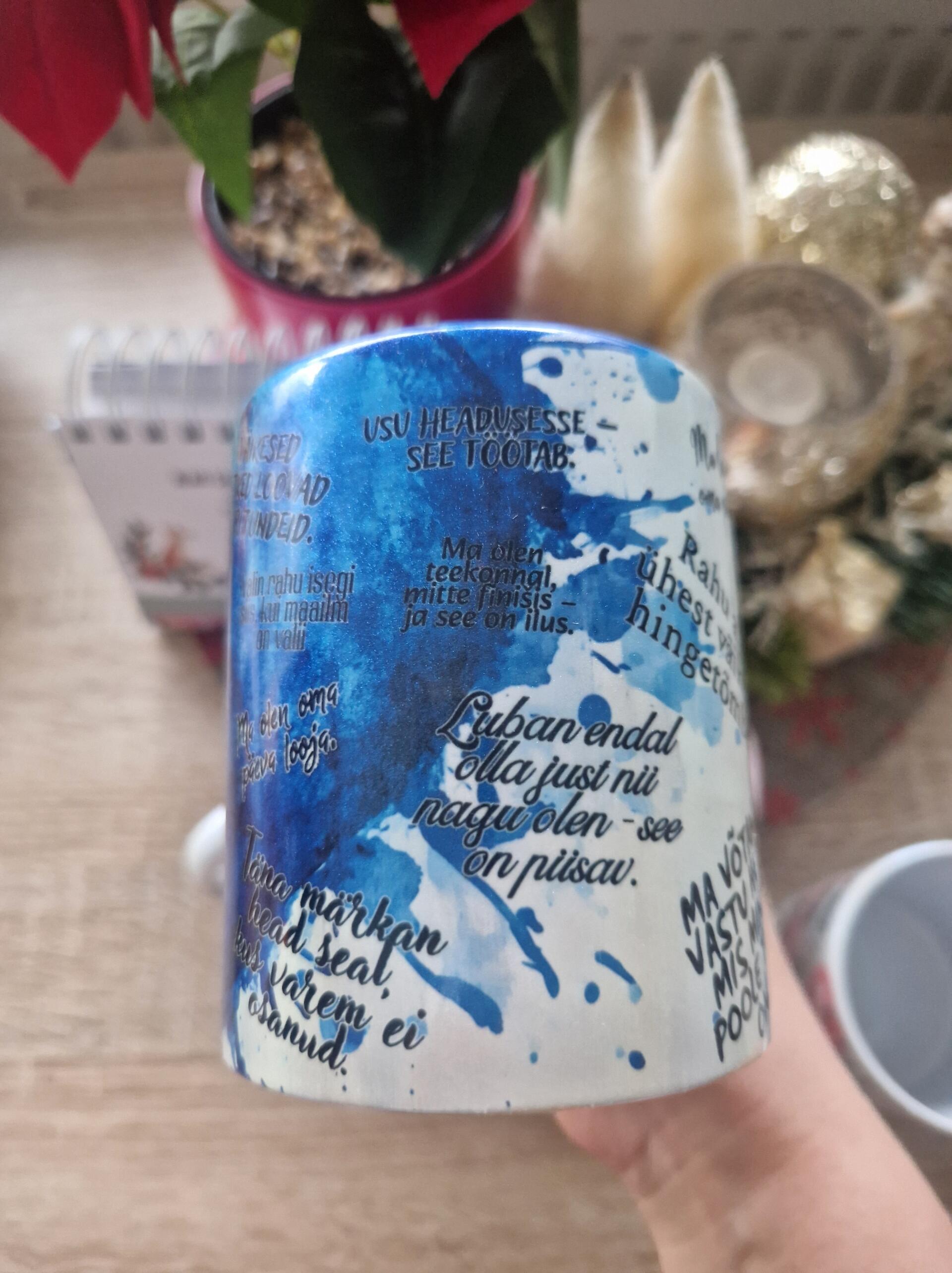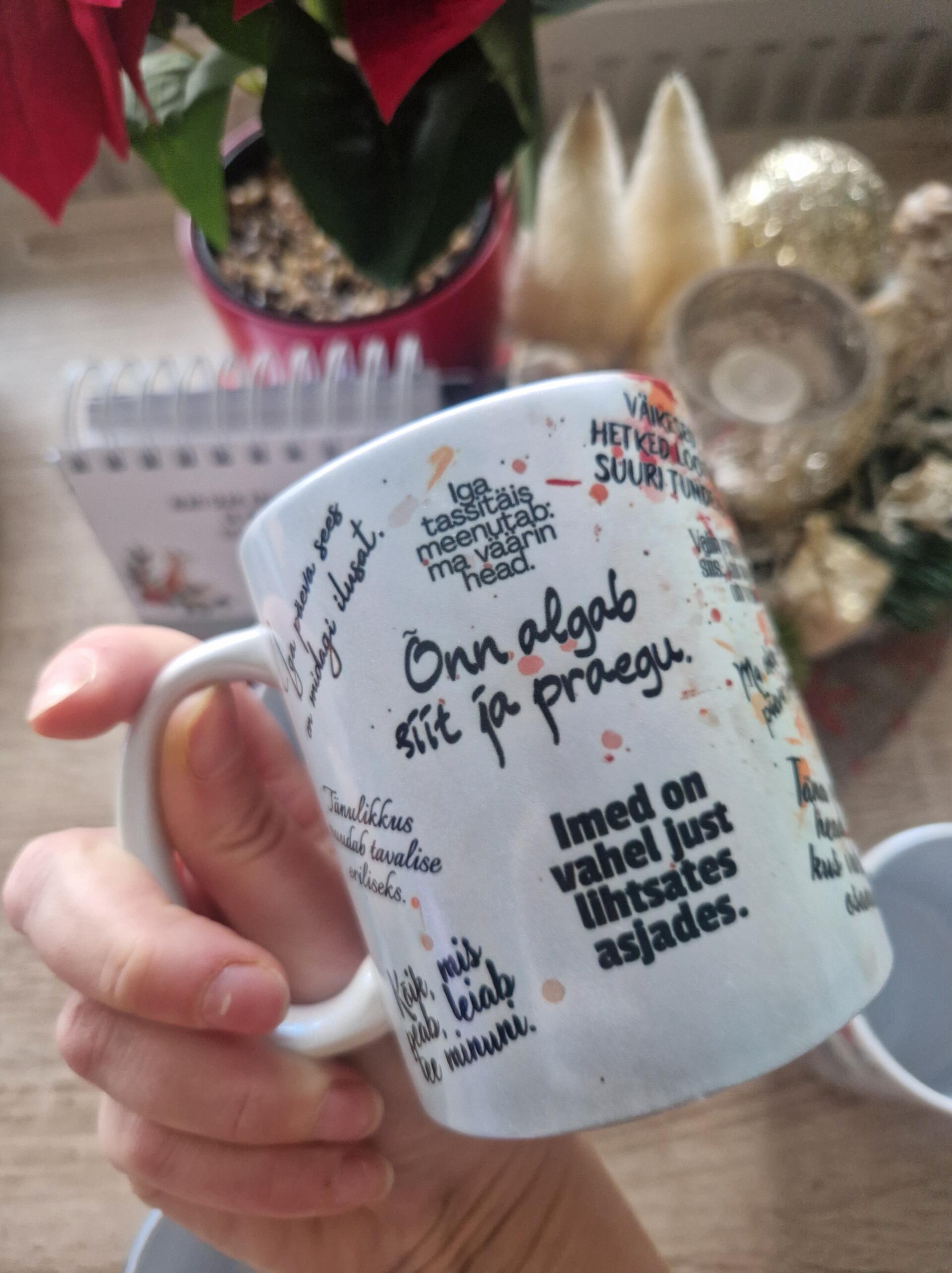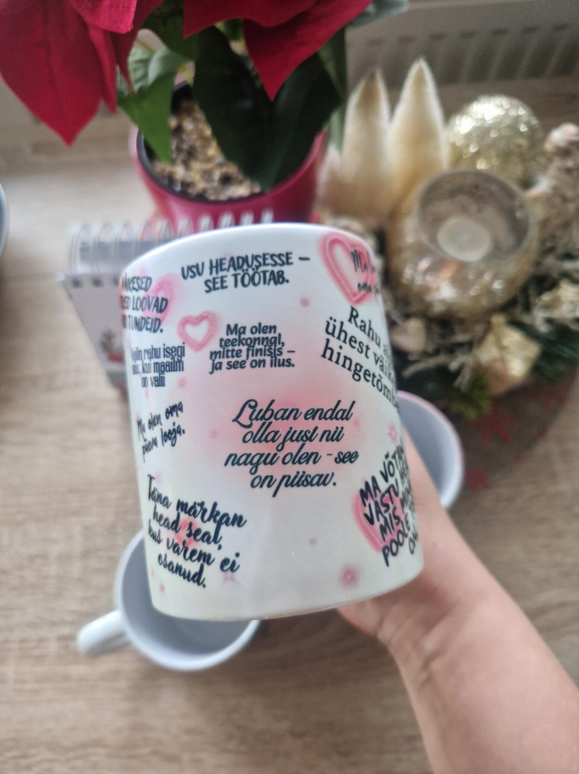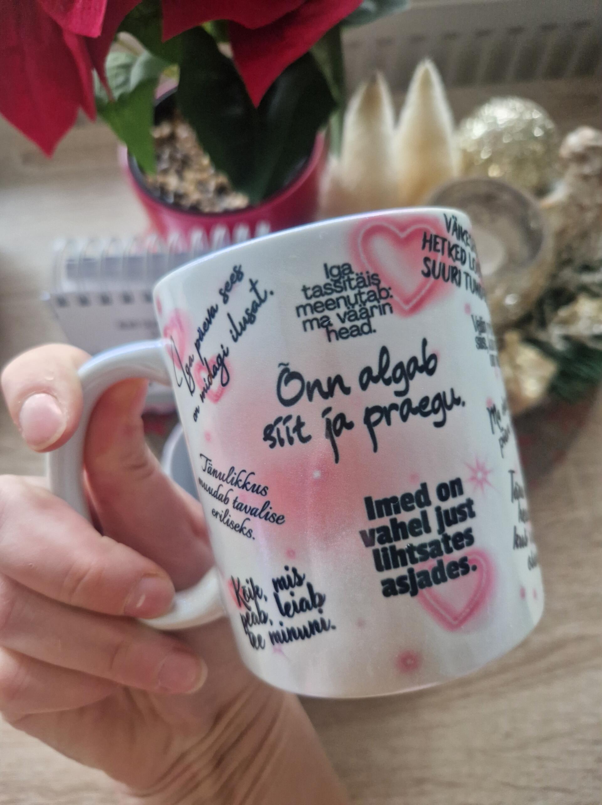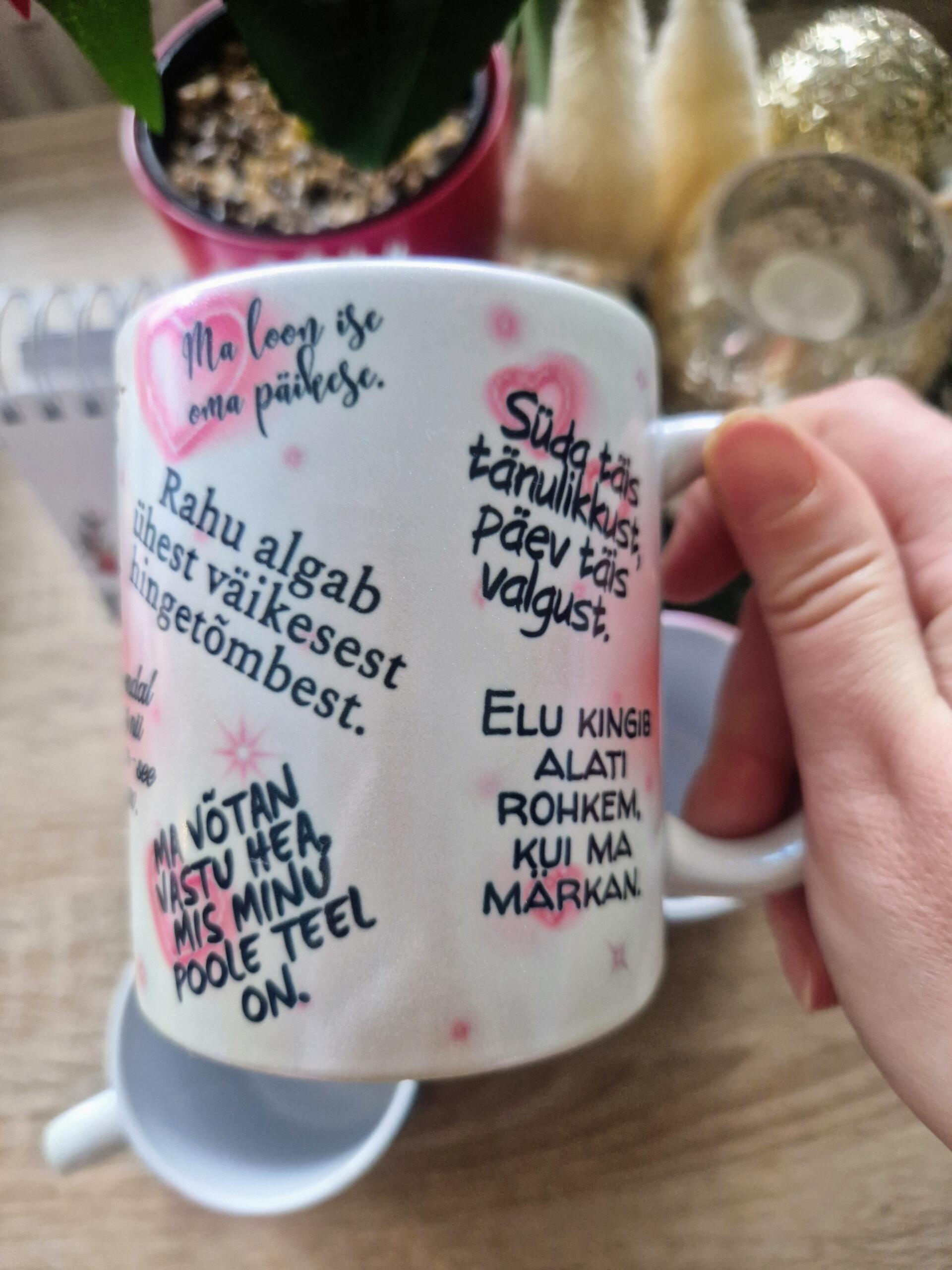 Alusta oma päeva naeratusega – kohvitass, millel on armas sõnum või inspireeriv tekst, teeb iga hommiku erilisemaks! Loo endale või kingi kallimale tass, mis räägib just seda, mida soovid öelda.