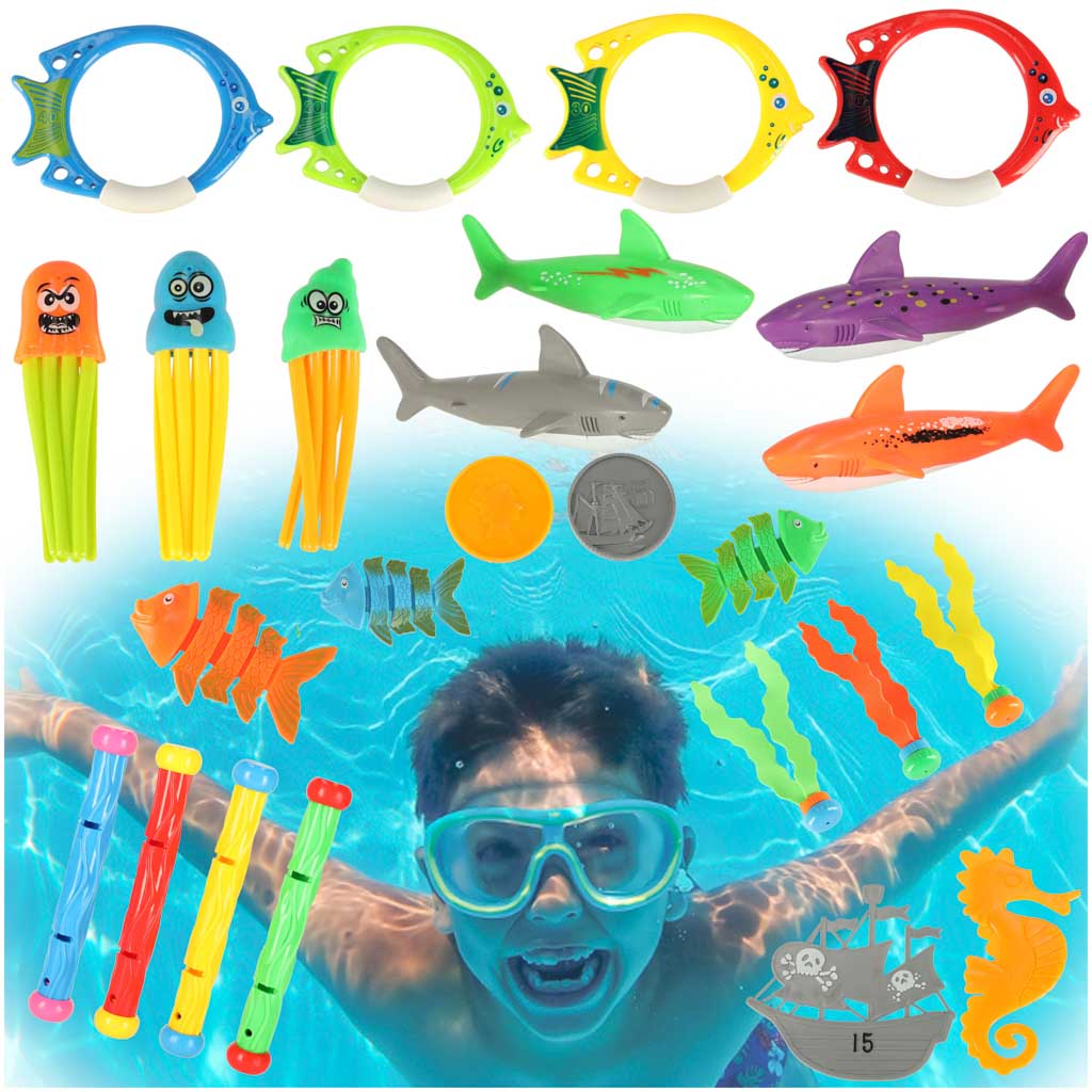 Komplektis on 27 laste basseinimänguasja: